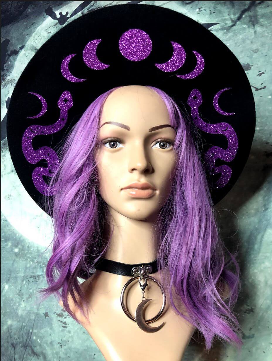 Don't miss out on this must-have accessory for your wardrobe. Get your Fedora Hat with Moon Phases and Snakes design in silver or lavender glitter today and add a touch of magic to your outfits!